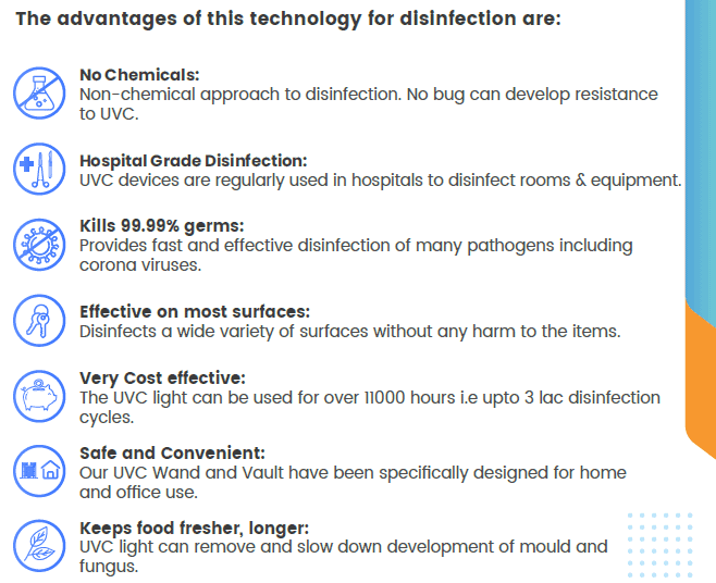 UVC disinfection is probably already being used at your home – In your water purifier! Ultra Violet light (C band) is a very effective way to disinfect against a wide variety of pathogens and is widely used in the food industry, in hospitals and homes. Our UVC devises have been especially designed to deploy this technology safely in your home and office for surface disinfection.