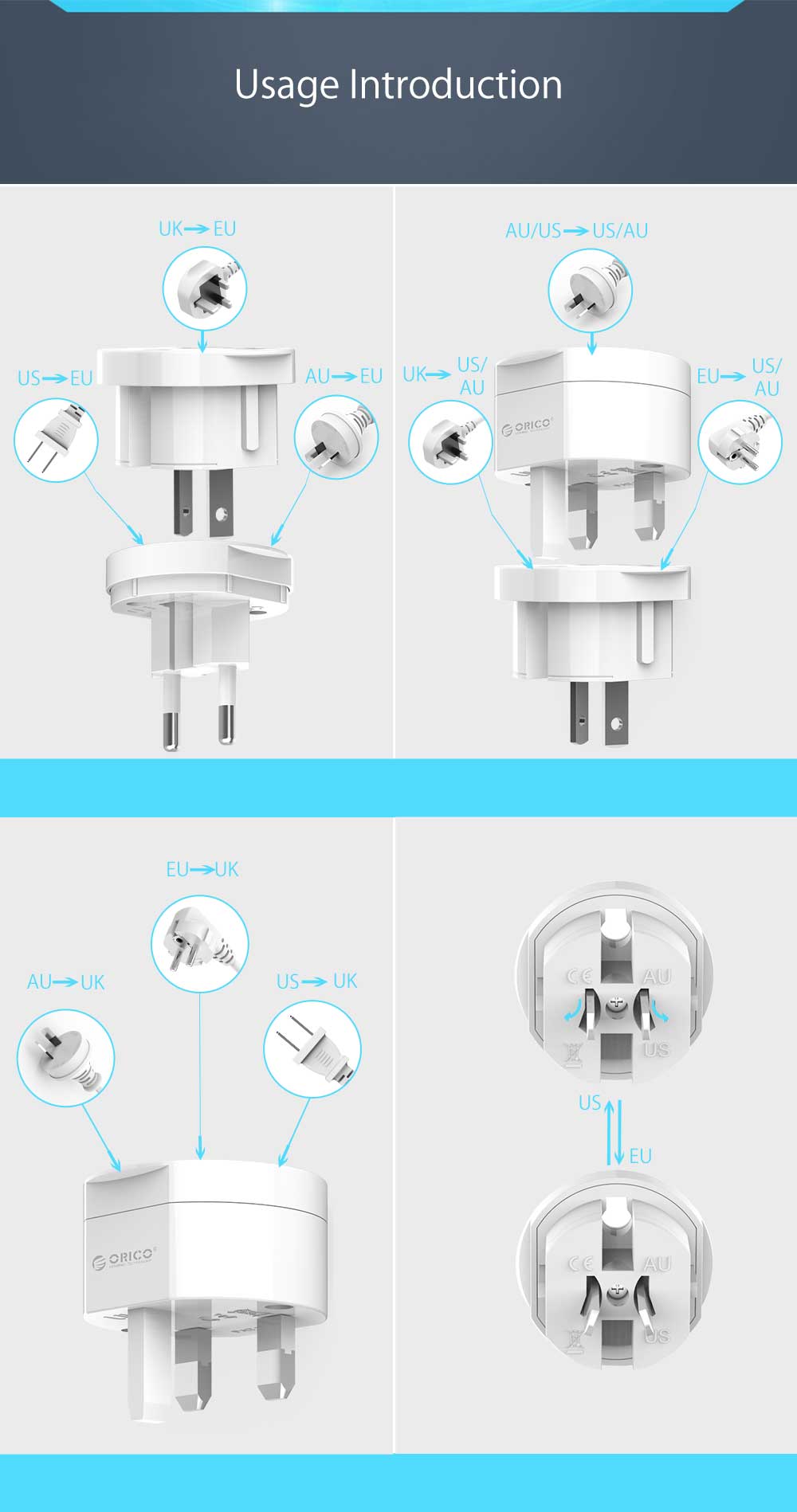 - Perfect for Travel, Universal Electrical Plug Adapter all in one for US/ UK/ EU/ AU