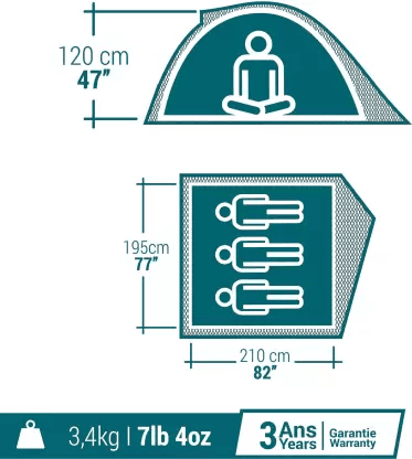 This tent has a classic dome structure - interiors are spacious enough for 3 people, side by side and exteriors are waterproof. All you have to do is fit the tent poles with the bedroom and then fit the flysheet on top. If it is windy it is advisable to attach the ropes that are provided in the tent bag.