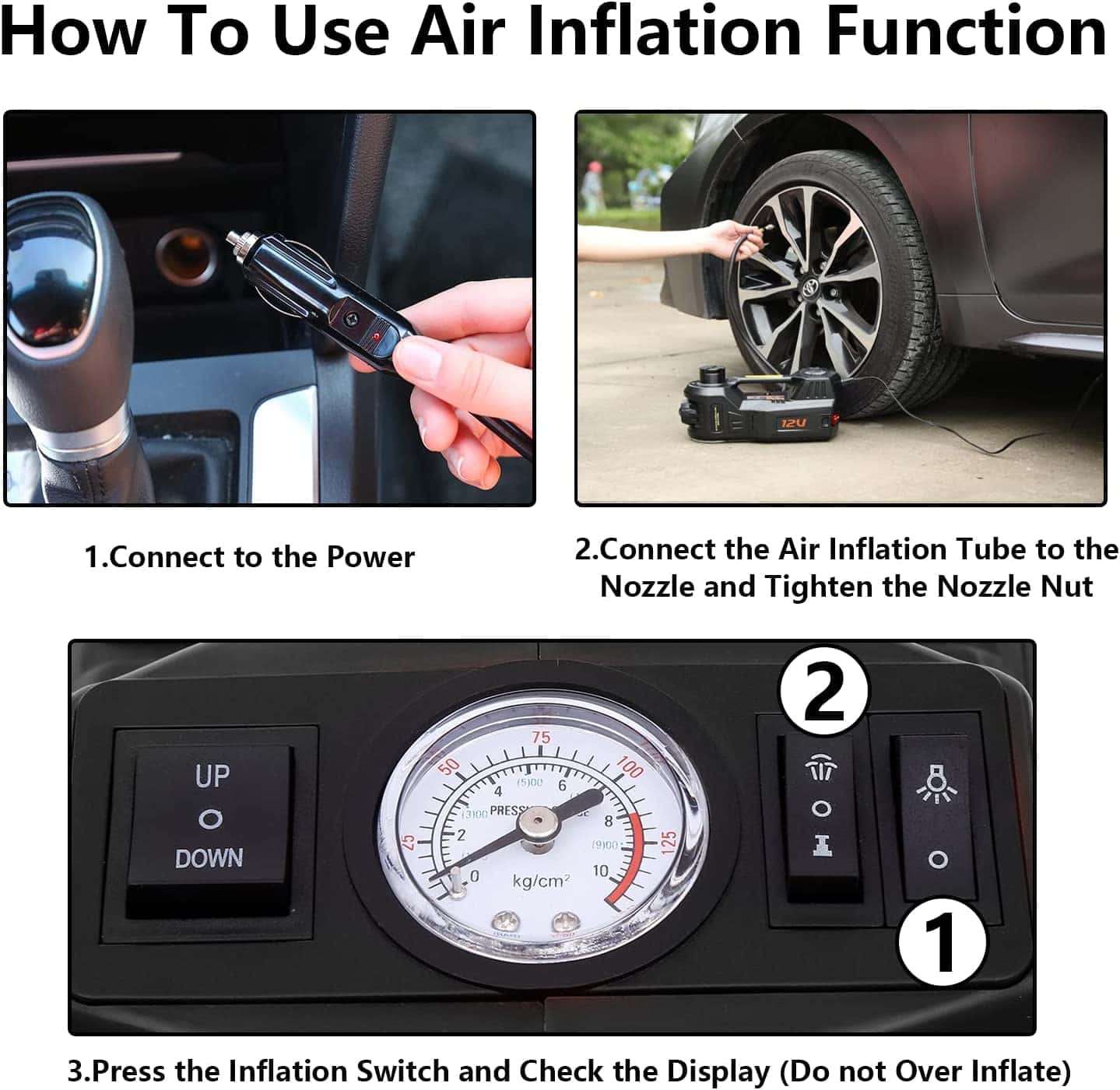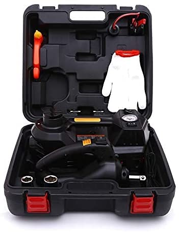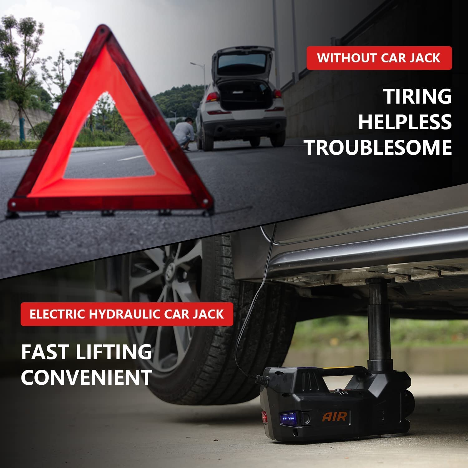 - The electric car lift jack has two-way power supply (battery clip with 12V DC power socket or car cigarette lighter) allows any adult to change and repair tires at any time on the garage, highway or on the road. The built-in flash LED light can run at night without any other lighting tools.