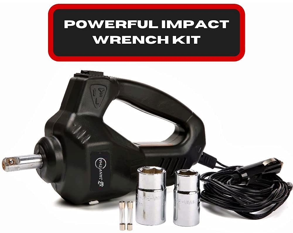 - This car jack kit is equipped with a high-speed impact wrench with built-in LED light for quick removal of the lug nuts on tire.