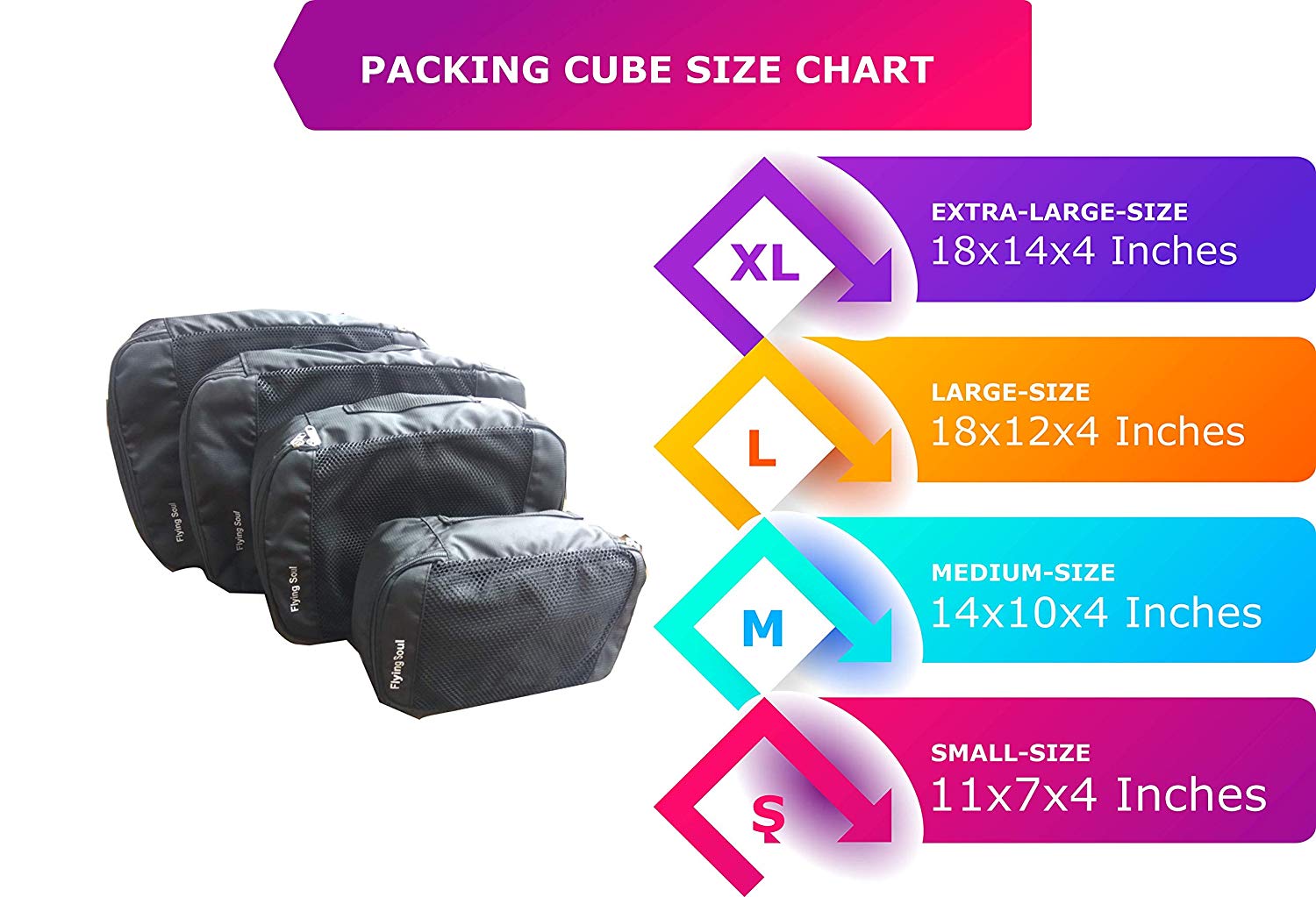 - PACKING MADE EASY – This 4 piece travel organizer set (1 small, 1 medium,1 large,1 XL packing cubes) compartmentalizes similar size items in their own “small drawers” to streamline packing and more efficiently utilize interior luggage space.