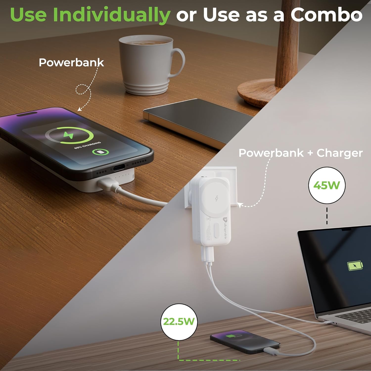 - Magnetic Combo Design – Snap the MagSafe powerbank directly onto the charger to recharge it magnetically, or use each individually – power gets split with 45W from charger & 22.5W from powerbank Type C port