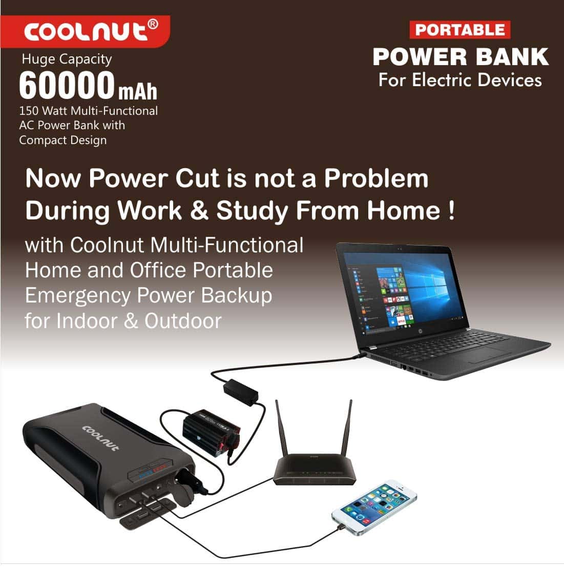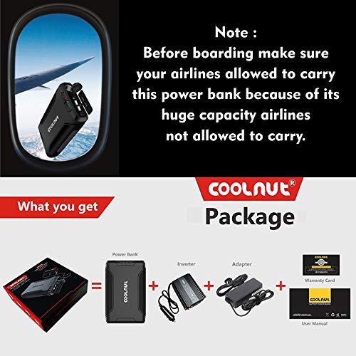 • WHAT YOU GET: Coolnut 60000 mAh External Battery Pack+ Charging Power Adapter+AC Inverter+User Manual + Worry Free 36-Months Product Warranty , 12 months Warranty on Accessories, friendly & outstanding customer service.