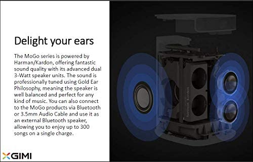 - The MoGo is powered by Harman-Kardon, offering fantastic sound quality with its advanced dual 3-Watt speaker units. The sound is professionally tuned using Gold Ear Philosophy, meaning the MoGo speaker is well balanced and perfect for any kind of music. You can also connect to the MoGo via Bluetooth or 3.5mm Audio Cable and use it as an external Bluetooth speaker, allowing you to enjoy up to 300 songs on a single charge.