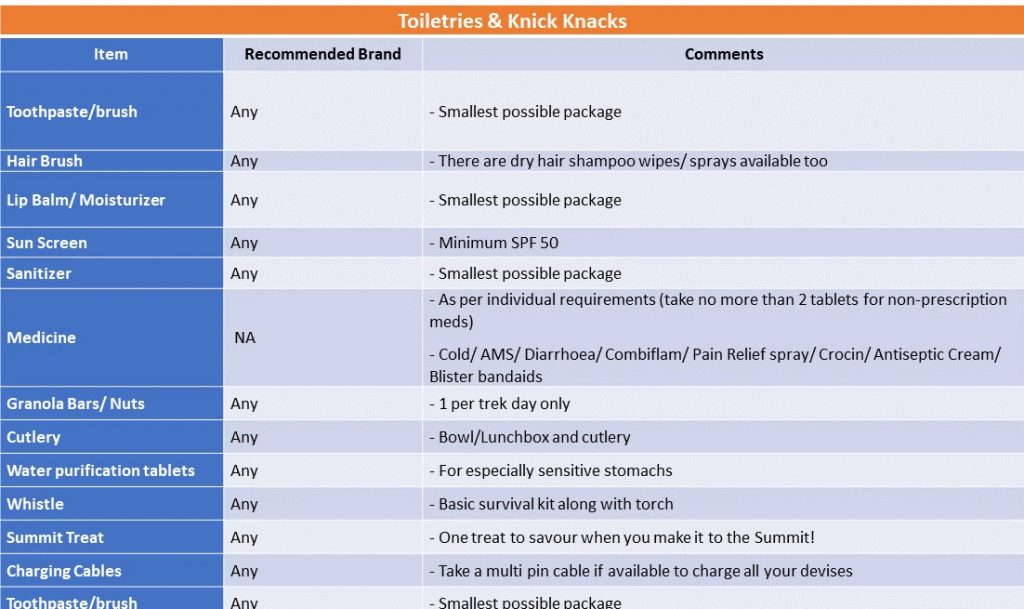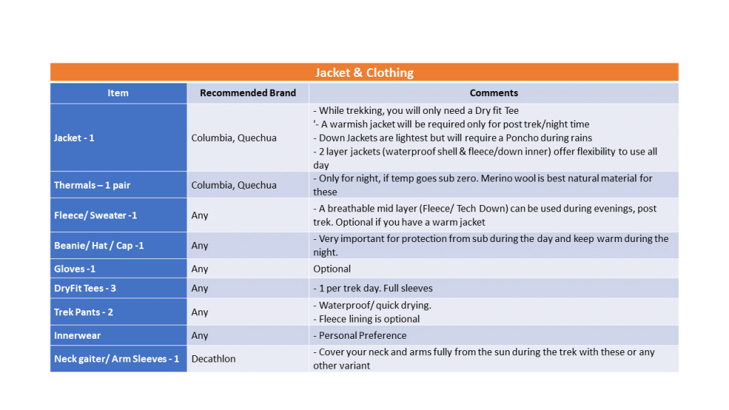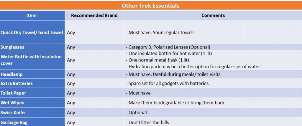 The main advice here is to ensure that your skin remains covered as much as possible during the trek. The mountain sun can be extremely harsh and your skin can tan/burn/ peel off in no time and just sun screen wont be enough to protect it. Hence, ensure you wear a hat, neck gaiters, full sleeve tees etc to protect these often overlooked parts of your skin. Another important thing to keep in mind is not go overboard in packing clothes. One can easily use trekking tees and pants on multiple days – just lay them out on the tent to dry and air out, after the trek is over.