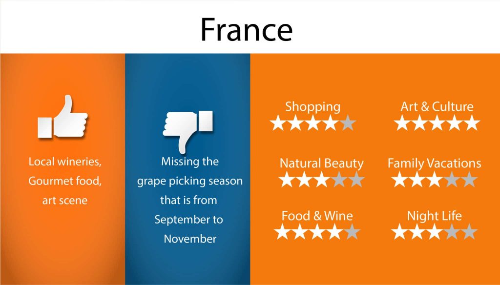 So, ask yourself what kind of vacation fits your mood this season. Find our top picks below and a quick rating of the most popular European destinations against 6 important elements that go into making for a perfect vacation!